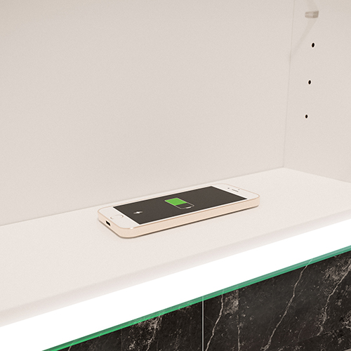 Laden Sie Ihr Handy während der Morgentoilette auf! Mit dem Induktionsladegerät in der Mitte des Schranks können Sie Ihr Handy jederzeit aufladen. Legen Sie Ihr Telefon einfach auf das Induktionssymbol und Ihr Smartphone beginnt zu laden.